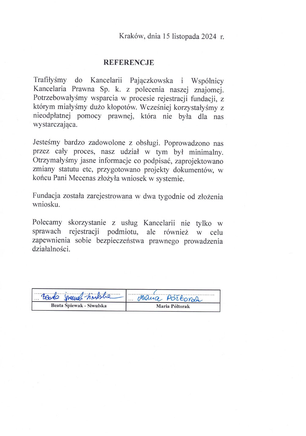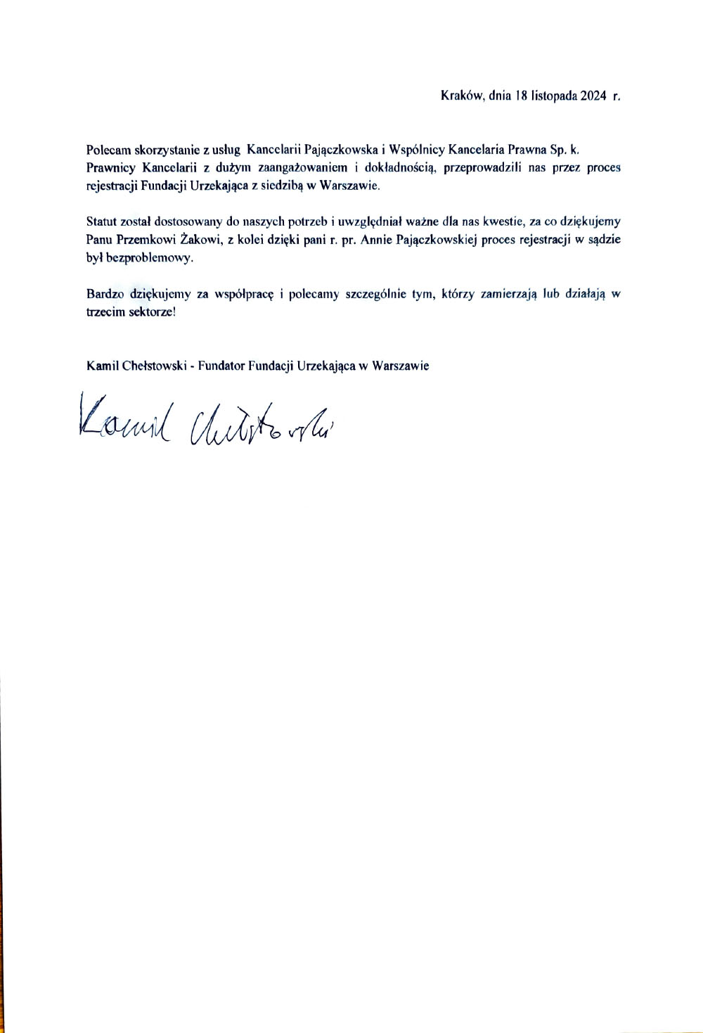 Obsługa naszych spraw świadczona była na bardzo wysokim poziomie z uwzględnieniem naszych potrzeb i specyfiki. Rekomendujemy korzystanie z usług Kancelarii Prawnej Pajączkowska i Wspólnicy.